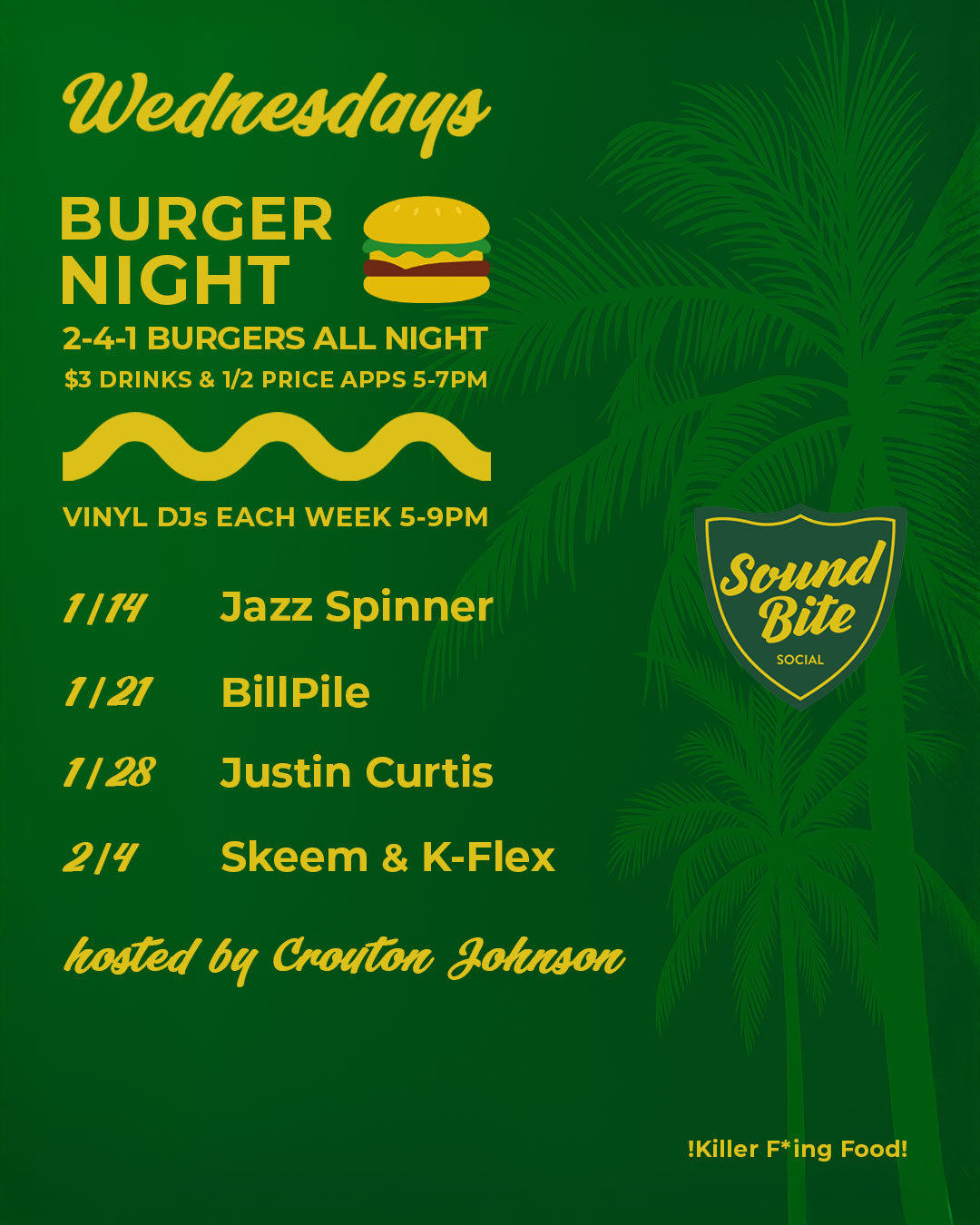 2 for 1 burgers all night, $3 drinks and 1/2 price appetizers 5pm – 7pm, and live vinyl DJs! Join us at Sound Bite every Wednesday.