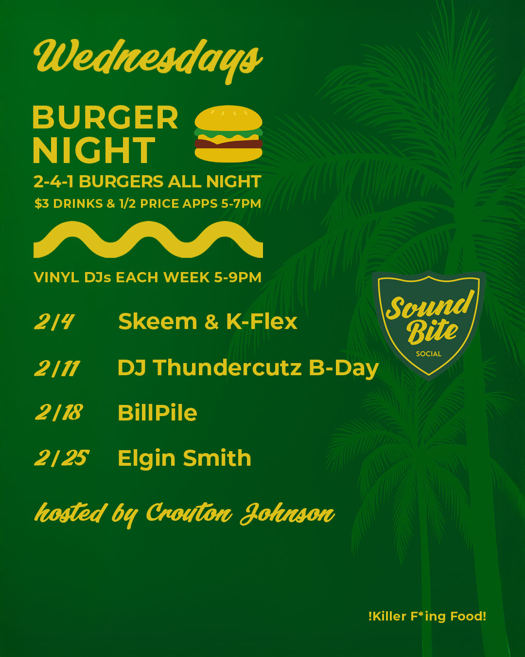 2 for 1 burgers all night, $3 drinks and 1/2 price appetizers 5pm – 7pm, and live vinyl DJs! Join us at Sound Bite every Wednesday.