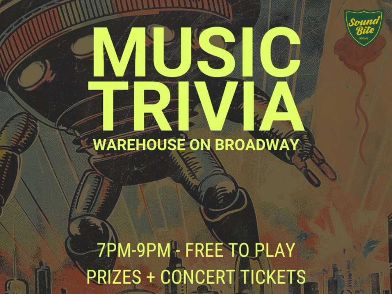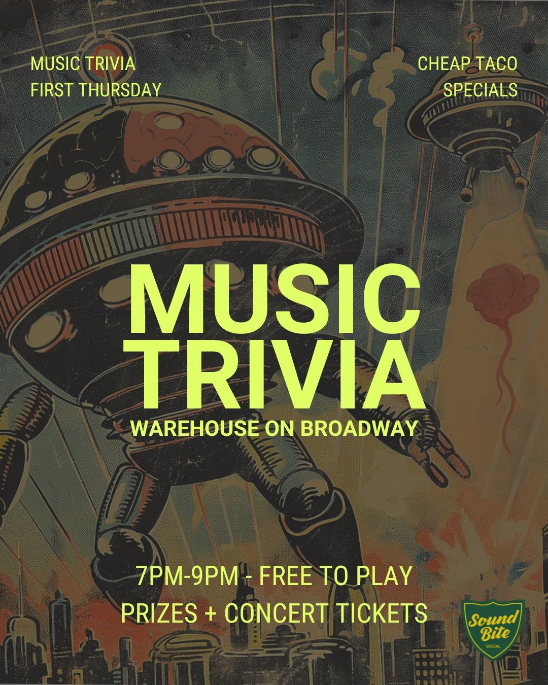 3 for $6 tacos all night, prizes, and concert tickets! Music trivia for audiophiles and pop culture fanatics. Join us at Sound Bite every first Thursday of the month.