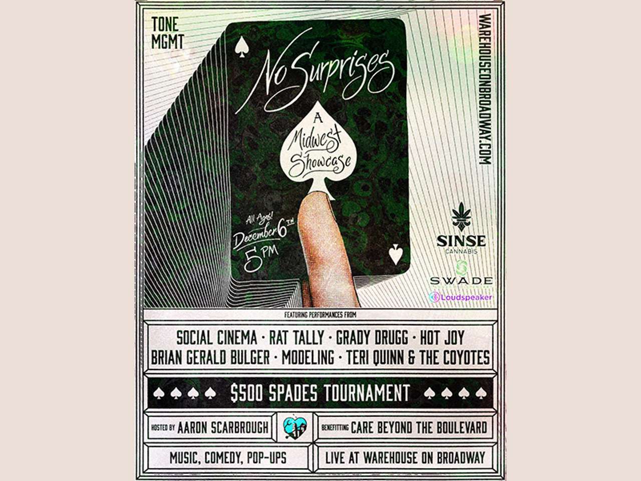 No Surprises is a half-day Midwest music, comedy, and vendor showcase and $500 Spades tournament benefitting Care Beyond the Boulevard (CBB). Greater Kansas City’s un- and underinsured rely on the free, vital mobile healthcare services CBB provides.
