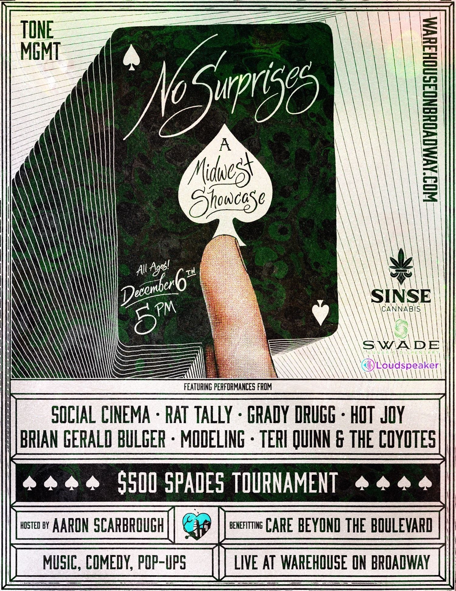 Emceed by comedian Aaron Scarbrough, No Surprises is a spotlight on who’s next in the region’s stacked indie and alternative music scenes, featuring Social Cinema (LNK/ICT), Rat Tally (CHI), Grady Drugg (SGF), Hot Joy (STL), Brian Gerald Bulger (KC), Modeling (NWArk), and Teri Quinn & The Coyotes (KC).