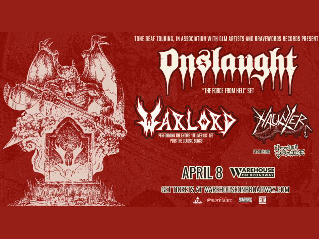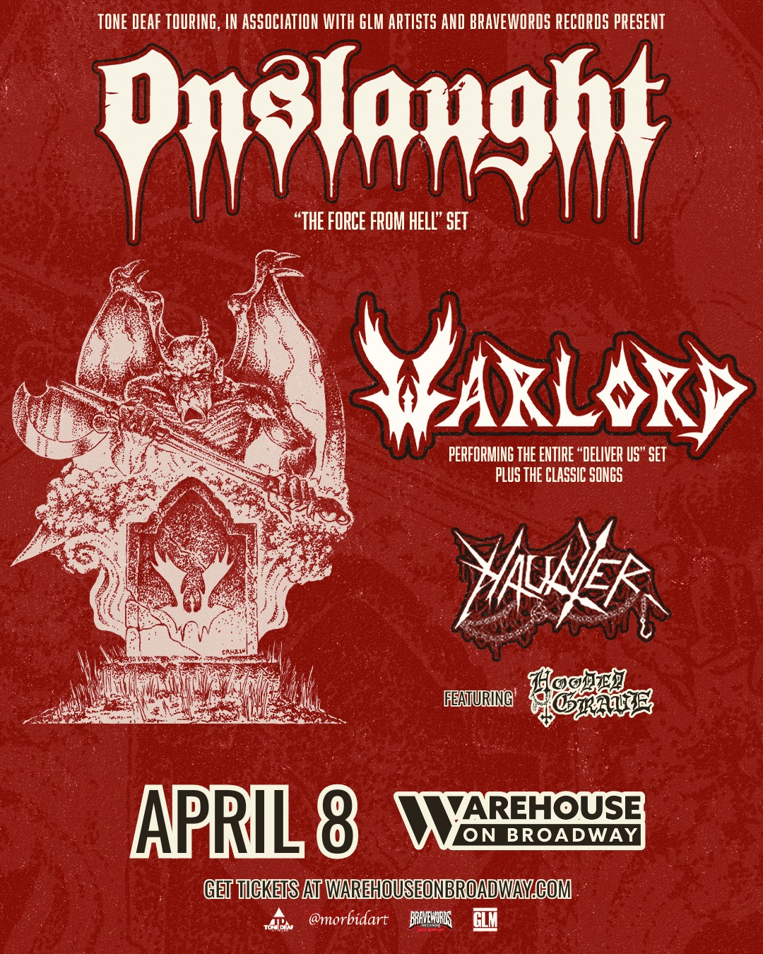 OG UK Metal Legends ONSLAUGHT are hitting North American soil for the first time in well over a decade performing their “The Force From Hell” set. It’s the perfect amalgamation of their 2 seminal albums The Force and Power From Hell and they’ve brought back classic era vocalist Sy Keeler for this very special tour. Despite being based in Los Angeles, cult metal heroes WARLORD have never played North America over their 40-year career span and are co headlining this tour, playing their seminal album, Deliver Us in its entirety plus more classic era material. The two bands embark on this tour de force after a special set at Hell’s Heroes in Houston TX. Get your tickets now!